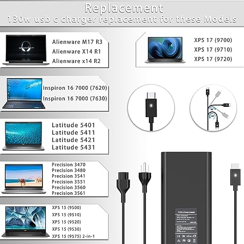 【Dell 130W Laptop Charger USB C】Replacement For Dell Latitude 5401 5411 5421 5431 5501 5511 5520 5521 5531 Dell Precision 3470 3480 3541 3551 3560 3561 3570 3571 3580 3581 5470 5480 5530 2-in-1 5550 5560 5570 5750 5760 5770 XPS 15 9500 9510 9520 9530 9575 2-in-1 XPS 17 9700 9710 9720Inspiron 16 7000 Alienware M17 R3 Alienware X14 R1 Alienware x14 R2 and more 130w dell laptop models with USB C charging port.