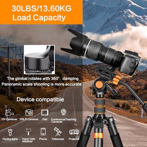 【Stability & Applicability】Made of aluminum alloy and with a load capacity of 22lbs make the tripod stable. Equipped with a standard 1/4″ screw mount, suitable for most DSLR cameras, compact camcorders, and digital cinema cameras, and it is also great for beginners and professional photographers.