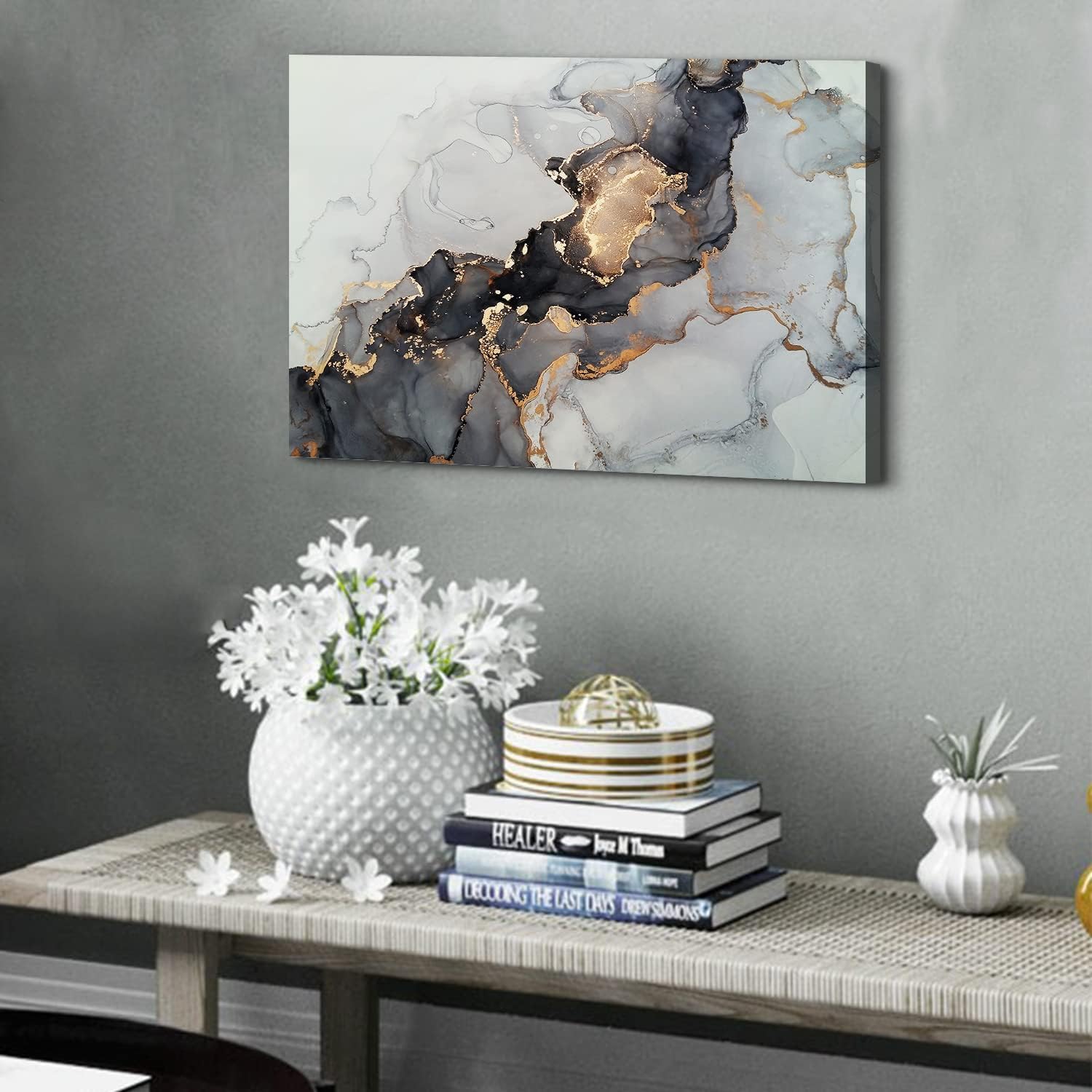 ❤️Black and Gold Wall Art Decor: Abstract marble texture canvas wall art well match any room decor style. Modern watercolor abstract gray fluid contemporary artwork painting makes it suitable to hang in living room, kitchen, master bedroom, TV walls, above bed, studio, hallway, entrance, yoga, salon, office, guest room, bathroom, dorm, lounge area, hotel, restaurant, dinning room, cafe, apartment, loft, gym, bar, etc. Fully express artistic feel and brings some modern elegant feel to your home decor.