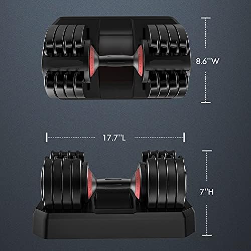 5 levels adjustable dumbbell: Dumbbell size is 17.7″Lx8.6’W’x7″H, 8 weight plates can be placed in the tray, 6.6lb 15lb 25lb 33lb 44lb 1 set of dumbbells can achieve 5 different weights, With dumbbell tray, convenient and safe storage.