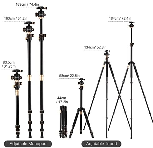 【With Flexible Ball Head & Detachable Monopod】The ball head supports 360° rotation, which allows you to get the perfect videos and amazing panorama photos easily. And one of the tripod leg can be taken off and works as a monopod or hiking stick, and usage height is adjustable from 80.5cm to 189cm(with ballhead and center shaft).