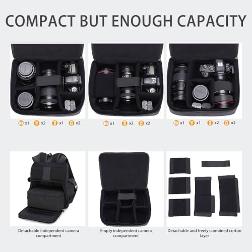 【Detachable Camera Cube that You Can Assemble Freely】:The Detachable Camera Cube in this photography backpacks has 5 detachable Velcro partitions and a seat belt, which can be freely combined to form 6 compartments. Up to 1 camera and 3 lenses or 2 cameras and 2 lenses can be put down to meet the storage of various photographic equipment. Detachable Velcro partitions are thick and soft, shock-absorbing and fall-proof, to better protect your camera, camera lenses, batteries and more.