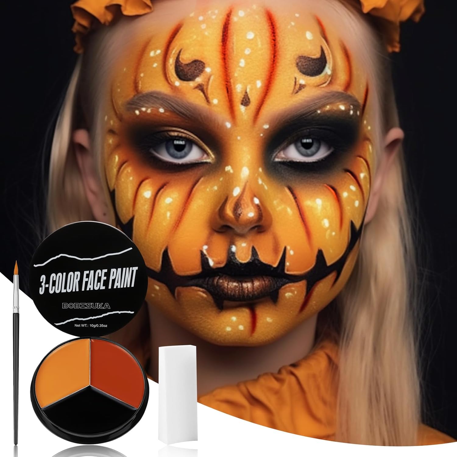 This Halloween face painting kit comes with 3 intensive pigmented colors that applies easily with sponge and brush. Sponge could make blending, fading and smoothing effortless. Brush provides great control & precision for body and face painting.