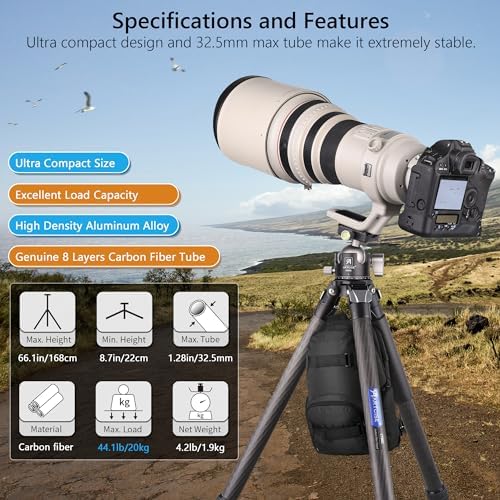 【Stable and Sturdy】CT80C professional tripod uses 8 layers of carbon fiber tubes and aluminum alloy, its maximum tube diameter is 1.2in/32mm, Loads up 55lbs/25kg. A hook and stone bag is also provided to hang additional weight for increasing stability when shoot in a windy condition,suitable for outdoor and travel shooting.