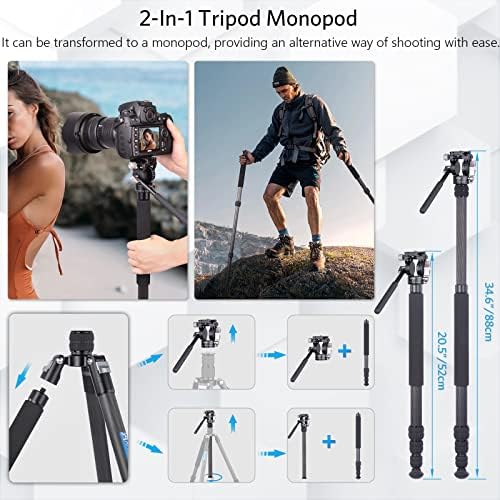 【Tall Portable 2Way Video Head Camera Tripod】: Inverted storage makes it more compact and portable, Max using height is 76.4inch/194cm but storage length of only 18.5inch/47cm, equipped with a mini video tripod head (with extra arca quick release plate), the two-section center column with the gravity hook is the standard design, but the accessory hole and the gift of magic hand and phone clip idea is unique to us.