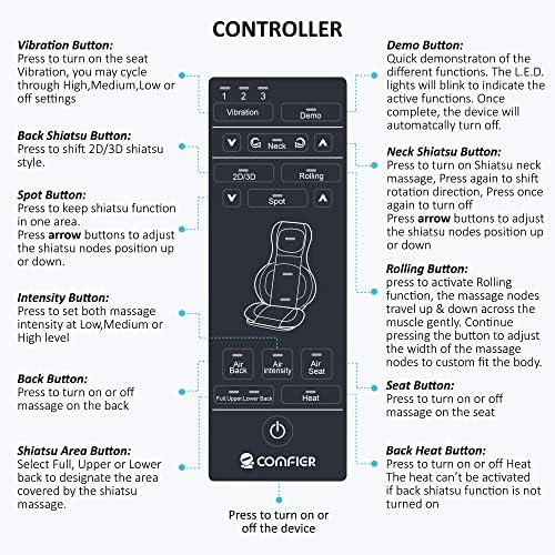 Massager for Neck and Back, Comfier shiatsu neck & back massager with heat utilizes innovative 2D/3D Finger Pressure Shiatsu, Rolling, Compression, Vibration and Heat functions to help you completely eliminate fatigue, stress. Enjoy a fantastic full body massage with the massage chair pad anytime.
