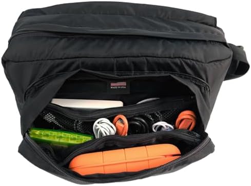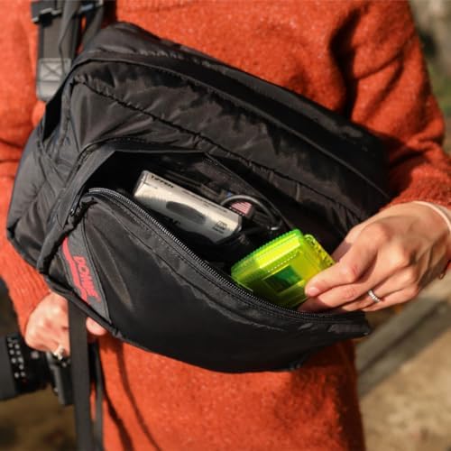 Secret Apple “AirTag” pockets 6 Liters total storage volume Durable and water-resistant materials Padded camera compartment with adjustable dividers Padded pocket stores up to an 11 inch tablet Accessory compartment with 6 interior pockets of various sizes & elastic cable loops Detachable waist/stabilization strap Padded shoulder strap w/storage for sunglasses, pens, business cards, memory cards, etc Hanging loop Padded back with breathable mesh Available in Black Nylon and RuggedWear Brown