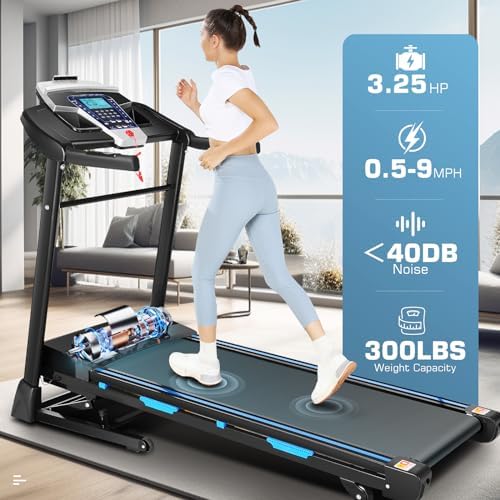 【Quiet & Powerful 3.25HP Upgrade Motor】Our treadmills use high-performance upgrade motors. Compared with traditional brushed motors, our upgrade motor treadmills are quieter, more powerful, and have a longer service life. When you use the upgrade motor treadmill, the maximum speed can reach 9MPH, which is more than enough for demanding cardio.With a weight capacity of over 300 lbs, this foldable treadmill is perfect for users of all sizes.