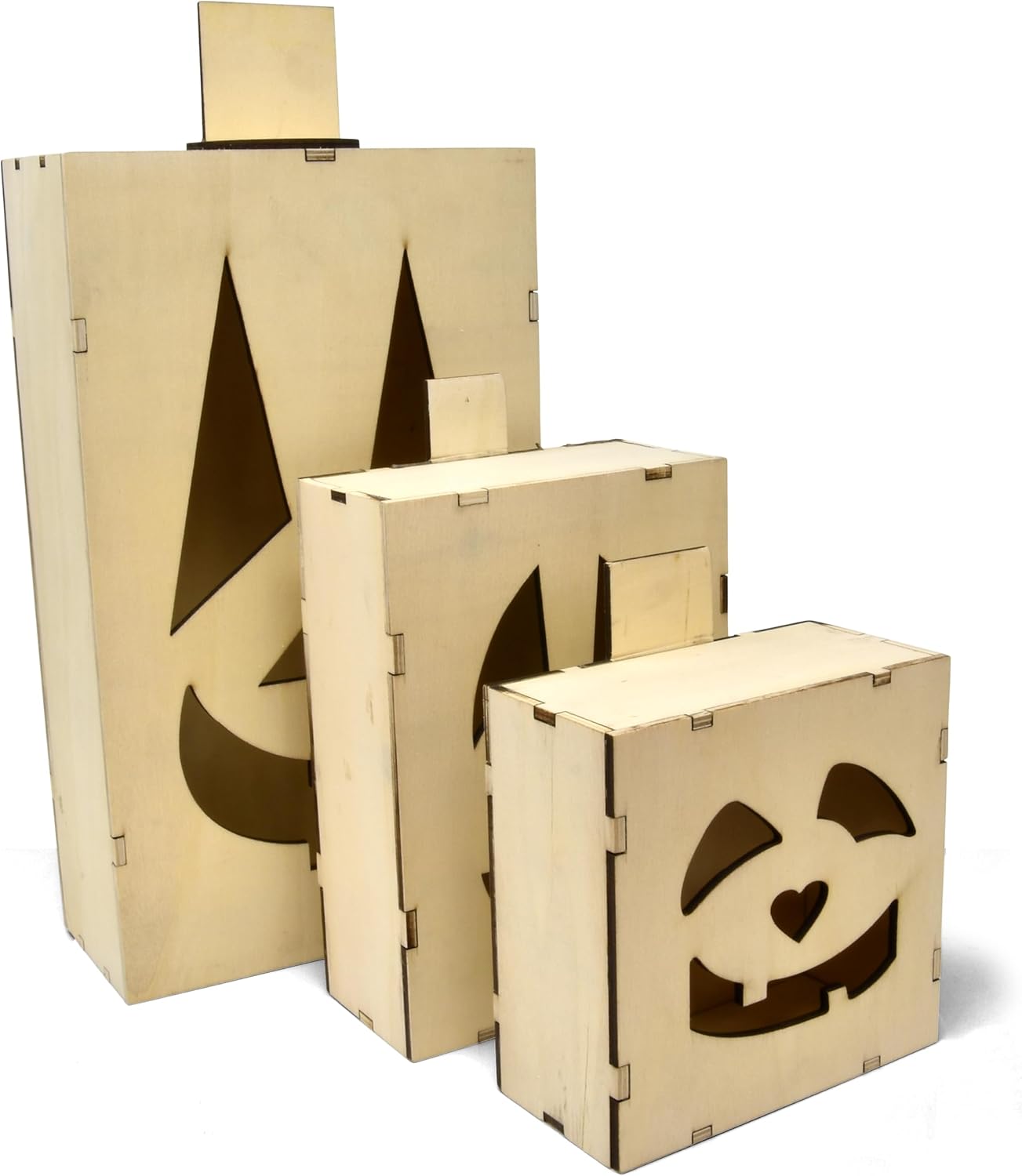 Full Set: do it yourself Wood Pumpkins Jack-o’-lanterns Paint Craft Kit; 3 sizes cutout spooky faces; 1 set of 6 acrylic paint 5 ml 5 orange and 1 black 3 paint brushes; With everything in one package you can make these Halloween crafts all by yourself Add some rustic touch to your Halloween and fall decoration customize using paint, wood stain, stencils, ribbon, lace, beads, and embellishments; You can also add string lights or button lamps inside to add more spookiness Wooden Halloween decorations measures: Large 13inch high x 6.5 inch length x 3 inch wide; medium 7 inch high x 5 inch length x 2.5 inch wide; small 5 inch high x 5 inch length x 2.5 inch wide Material: The pumpkin cutouts are made of high quality plywood smooth; unfinished wood surface that’s great for crafting; sturdy and lightweight not easy to break or deform Paint and make these blank wooden decor come alive, then display them with your matching Halloween decor accents; They can be used as table centerpiece, desk display, or place in any place at your home