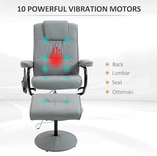 10-point vibration massage in the back, lumbar, seat, and ottoman; Choose from pre-programmed massages or manual mode; Two intensity levels and five functional modes for various types of massages; PU faux leather upholstery is luxurious and easy to maintain; 360-degree swivel base and an adjustable backrest that reclines up to 145 degrees; Remote control included with a handy side pocket for storage; Assembly required;