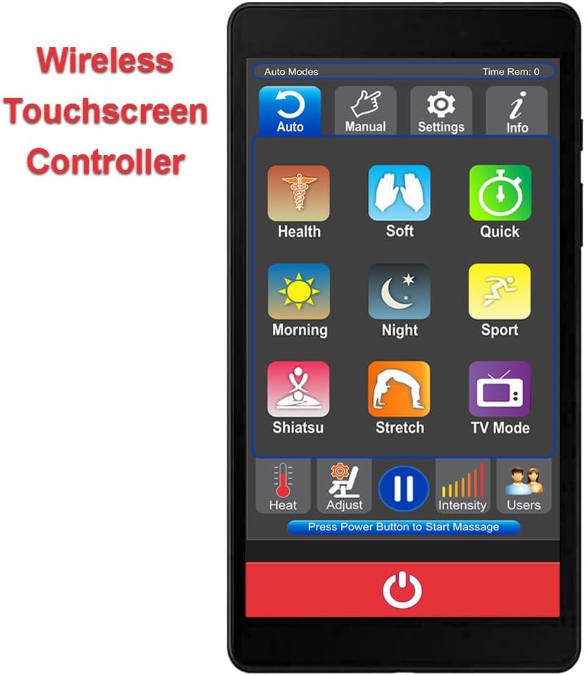 PATENTED HAND ROLLERS that work in harmony with air massagers. ZERO GRAVITY (neutral body posture position) which has been proven to heighten the state of relaxation and well-being. BODY TWISTING STRETCH by advanced air compression. AUTOMOTIVE INDUSTRY LEATHER for the entire chair. Adjustable HEAT for Hands, Lower Back and Feet for comfort and relief. PATENTED POSITION ADJUSTABLE BICEP/SHOULDER MASSAGERS that allow for various user’s heights. Most technically up-to-date, smart handheld TOUCHSCREEN CONTROL.