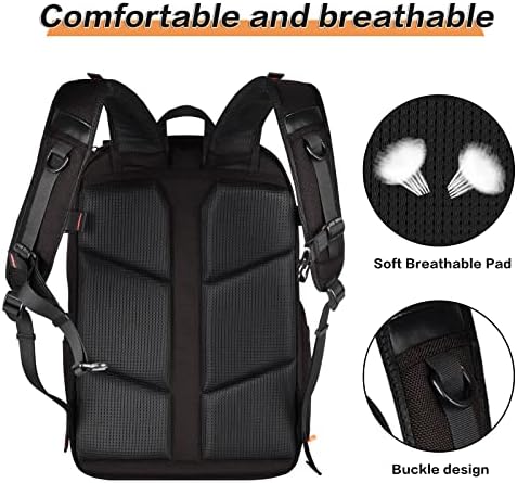 Padded removable modular inserts in the lower compartment is designed as customized dividers for different cameras and camera equipments. Customer can adjust the space based on their needs. Compatible with Nikon D7100, D7200, D7500, D5600, D5300, D3500, D3400, D3300, D3200; compatible with Canon EOS Rebel T6, T6i, SL2, SL3; compatible with Sony Alpha A6000 A6100 A6300 A6400 A6500 A6600 A5100 and other standard-size DSLRs cameras. Also designed to be compatible with DJI Mavic Drone.