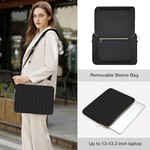 The main inner compartment holds your laptop and tablet. Front zipper pockets is good for quick-access and store cell phone, wallet, keys and other items. The detachable sleeve bottom has hook & loop can slides into the front belt and securely fastened to the front of the bag, compatible with MacBook, Notebook, Ultrabook 13-13.3 inch; may not compatible with all laptops. The detachable and adjustable shoulder strap allows you to switch the way to carry the tote bag freely.