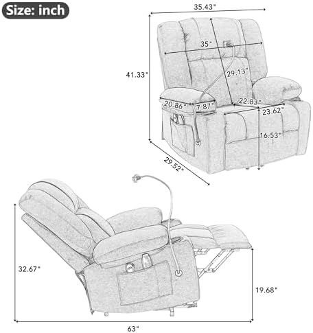 Massage and Heating Functions- This power recliner comes with 8 vibrating points around the chair and 1 lumbar heating point. Both can turn off in fixed time 15/30/60 minutes. You can have a full body massage to relax the upper back, lower back, thighs and lumbar spine. It also has a heating function, which can further promote blood circulation during massage.