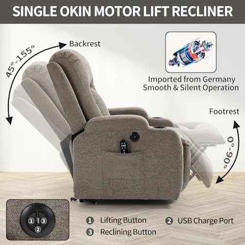 Infinite Position Okin Motor Up to 350 LBS Power Lift Recliner Chair for Elderly, Heavy Duty Motion Mechanism with 8-Point Vibration Massage and Lumbar Heating, USB Port, Cup Holders, Brown
