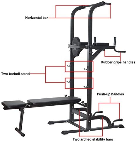 【Multi-station Tower】Our multi function power tower with a variety of station and positions will provide you with over 20 different exercises to train your different muscle groups,like push-ups, pull-ups, sit-ups, chin-ups,tricep dips,vertical knee raises,lat pull down,multiways bench press, leg exercise, preacher curl, sit up and barbell exercise. So train hard and get the results you want with our high capacity multi-function power tower