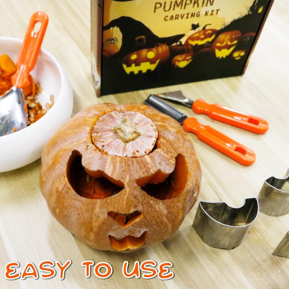 [High-quality Stainless Steel and Washable] 24pcs carving set are made by premium stainless steel, thicker, durable, be-used for many years. Non-slip handle design for easy to grip. Plastic handle make carving any pattern a breeze. Our pumpkin molds for carving clean up easily in the dishwasher, towel dry and store for reuse.
