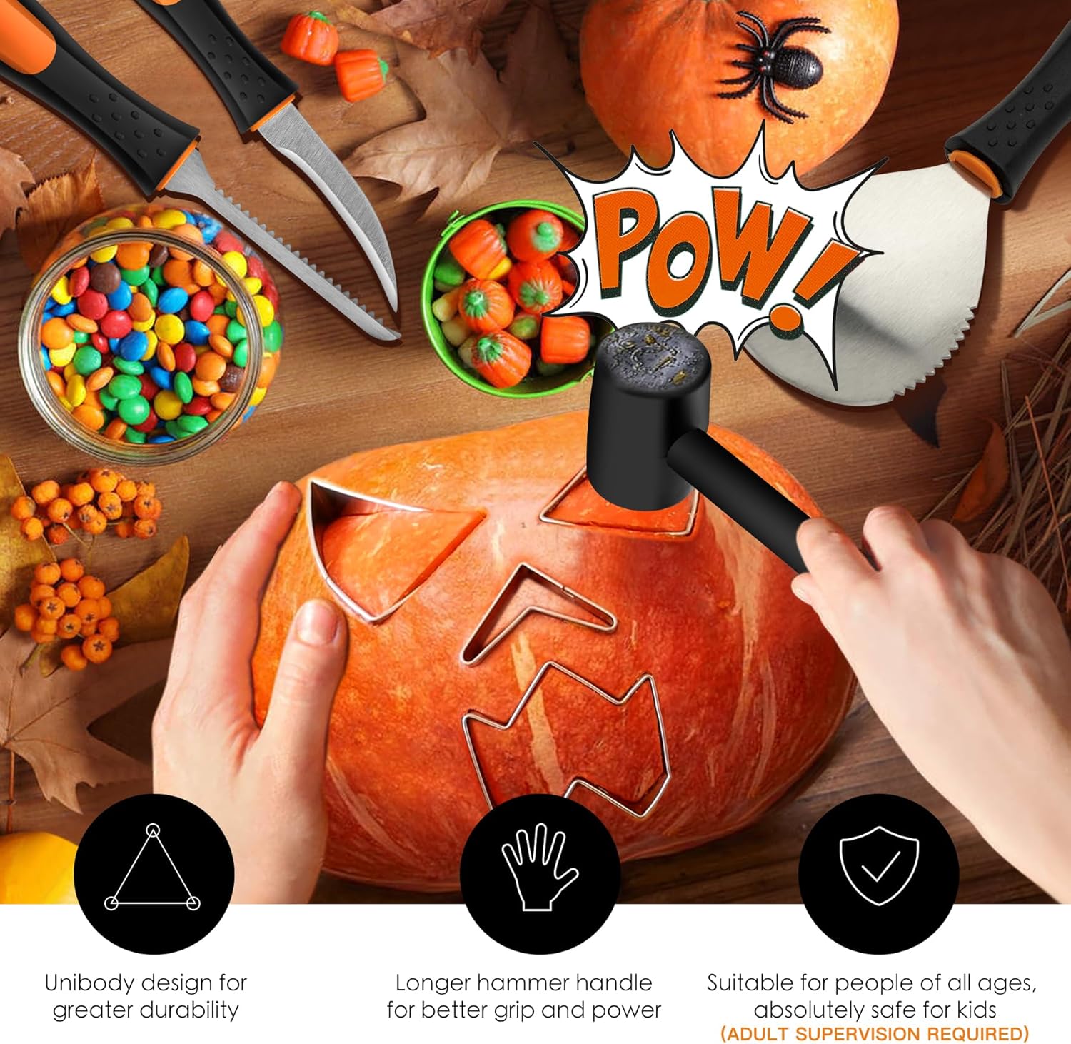 Pumpkin Carving Kit Halloween, Pumpkin Carving Tools, 8 Stainless Steel Molds -Deepened, 3 Pumpkin Carving Tools with Hammer -Reinforced Handles for Halloween Decoration Lanterns Kids Adults Suitable