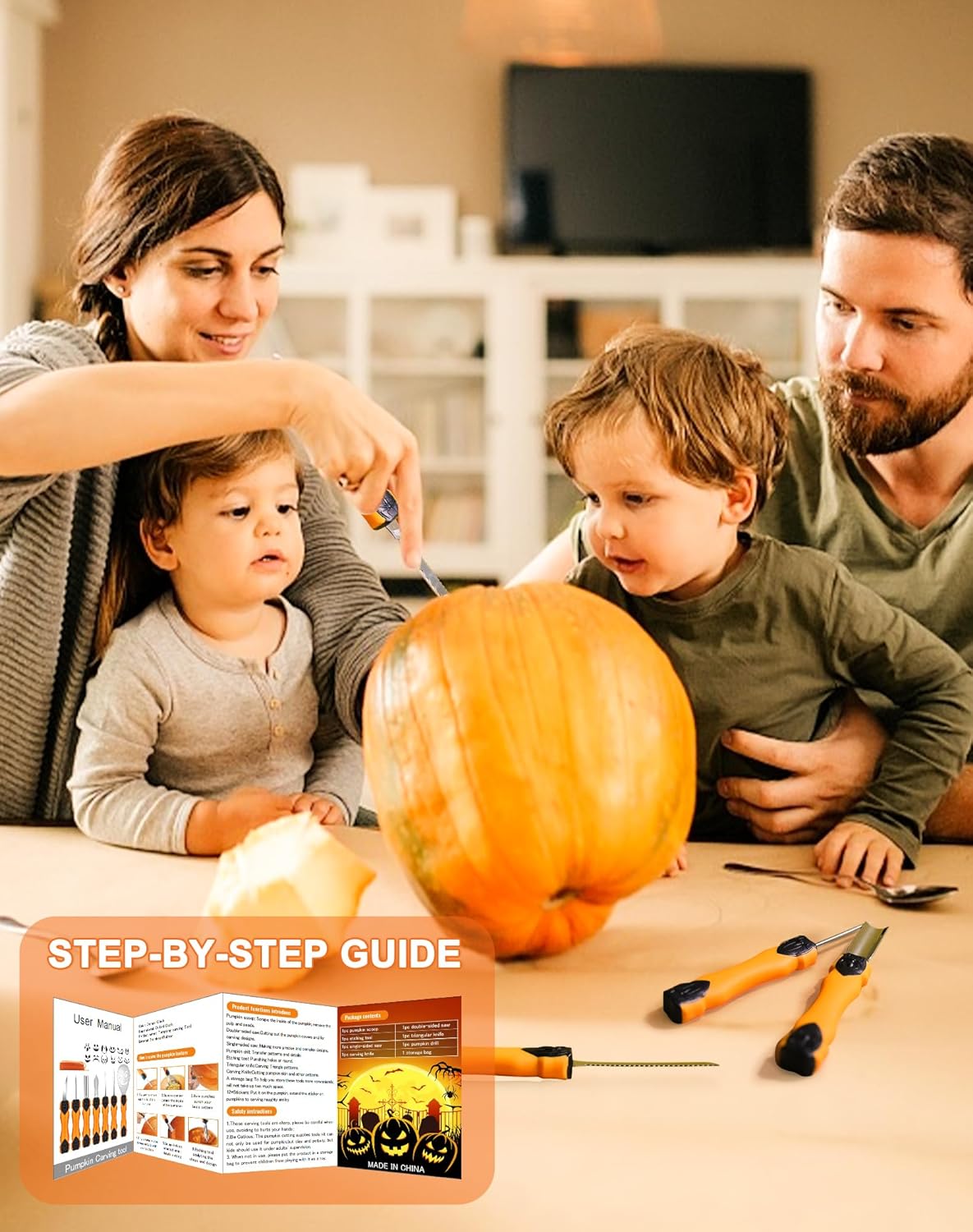 SHARP & STURDY KNIFE: The blade of the pumpkin carving tools is made of sharp stainless steel, which will not bend, deform, or break when carving hard pumpkin skin, allowing you and your family to have a perfect and easy DIY pumpkin lantern experience.