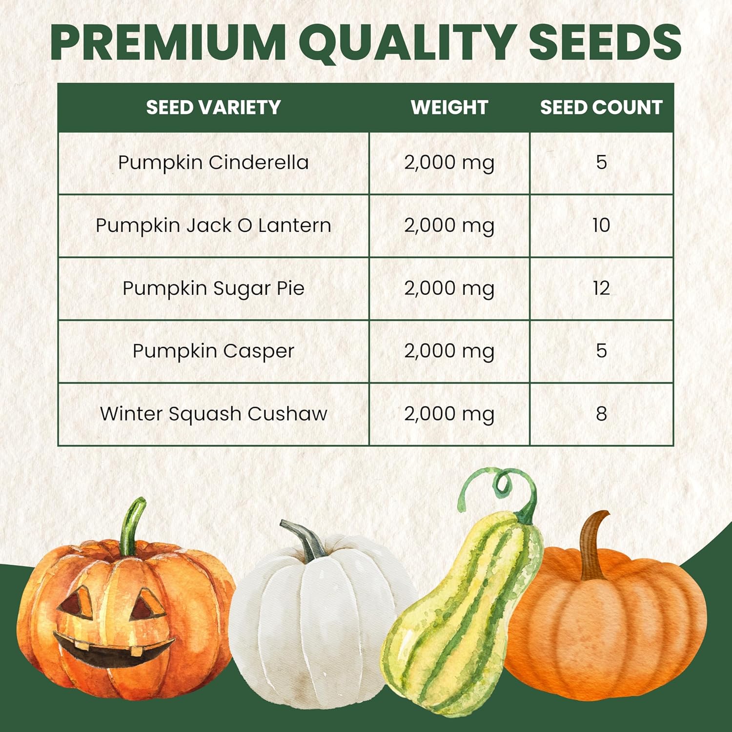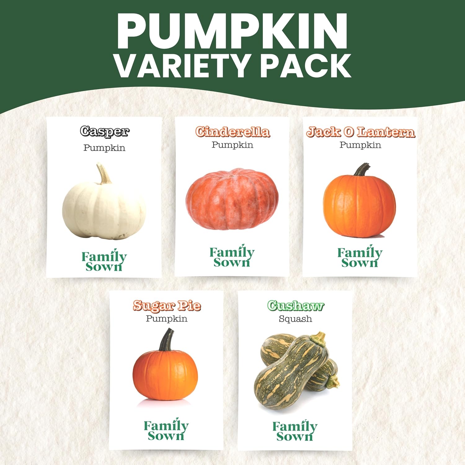 5 INDIVIDUAL SEED PACKETS: Pumpkin Cinderella, Pumpkin Jack O’ Lantern, Pumpkin Sugar Pie, Pumpkin Casper, Winter Squash Cushaw. Create stunning fall displays and enjoy fresh, homegrown pumpkins for cooking, carving, and baking.