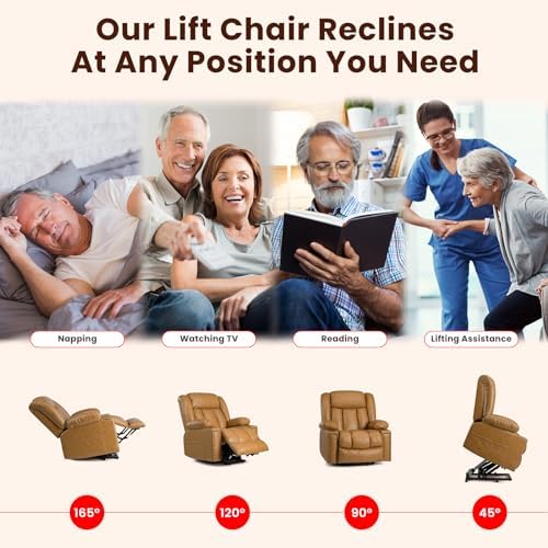 Cfvyne Small Power Lift Chairs Recliners for Elderly with Heated and Massage, Overstuffed Adjustable Lift Chairs, 3 Positions, Breathable Leather, USB-A and USB-C, Cup Holder, Side Pocket, Caramel