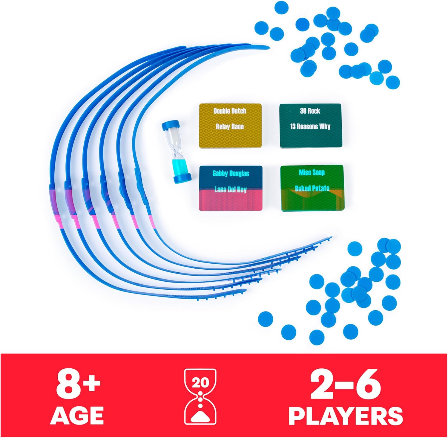 Includes: 6 Headbands, 48 Scoring Chips, 200 Cards, 1 Sand Timer, and Instructions. For 2 to 6 players