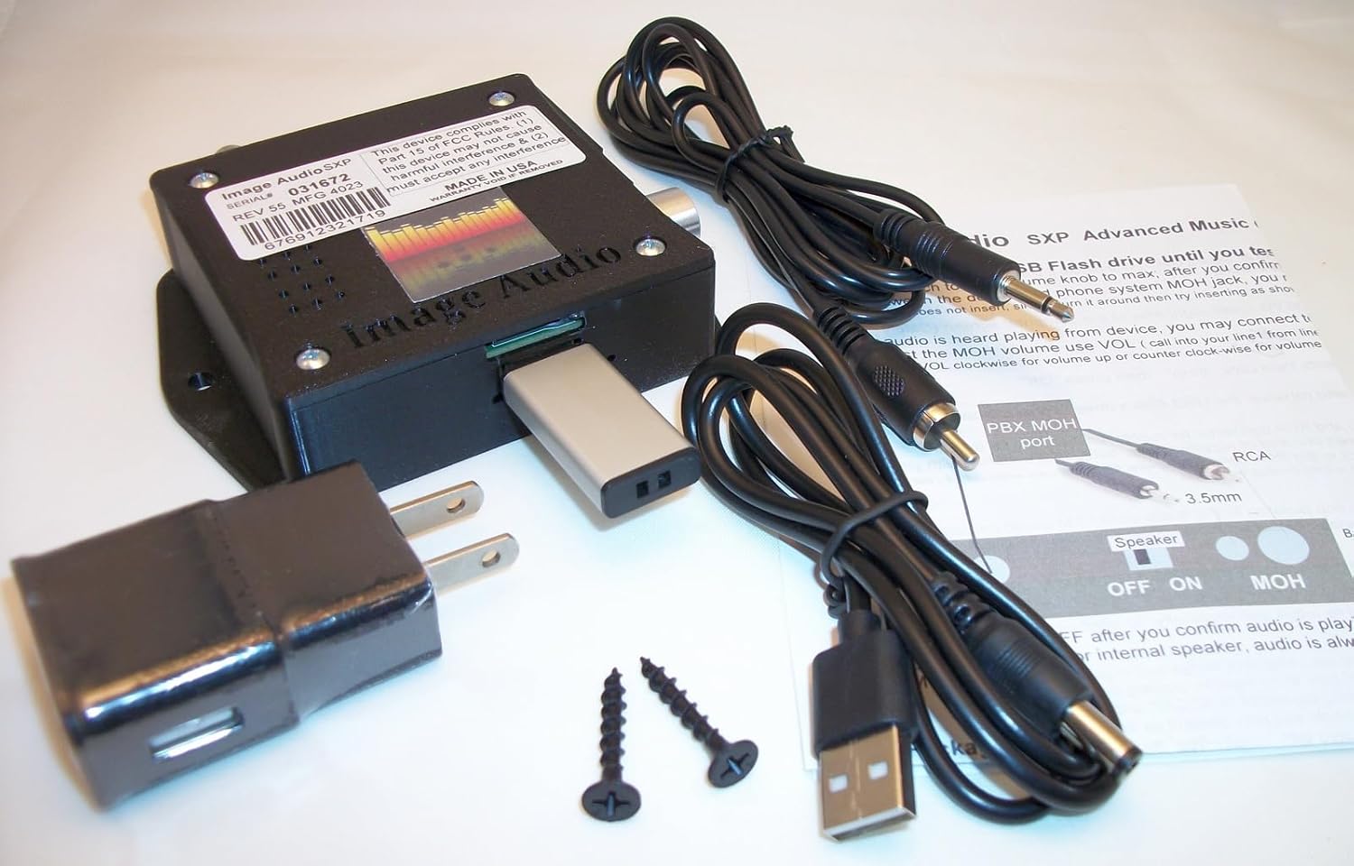 SUPER EASY CONNECTION: Preloaded USB Flash drive with over 50 mp3 files (including Holiday files) Plug and play – hours of royalty free music and standard thank you for holding messages — Built-in speaker – Monitor the audio on the device directly via the built-in speaker – Place on a shelf or easily mount to any surface via built-in wall mount.