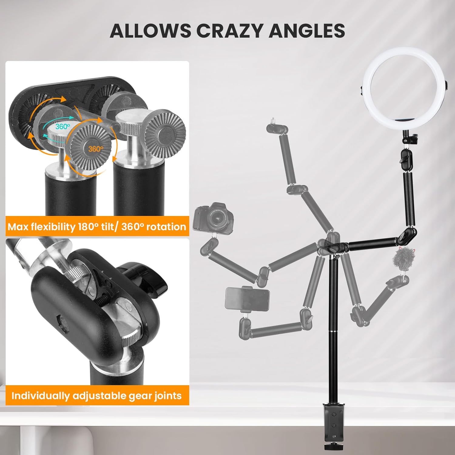 Resilient and Stable: Can be loaded horizontally up to 6.6 pounds and vertically up to 11 pounds. DSLR cameras, 19-inch ring lights and projectors can be attached without any worries. Truly a small crane on your work table