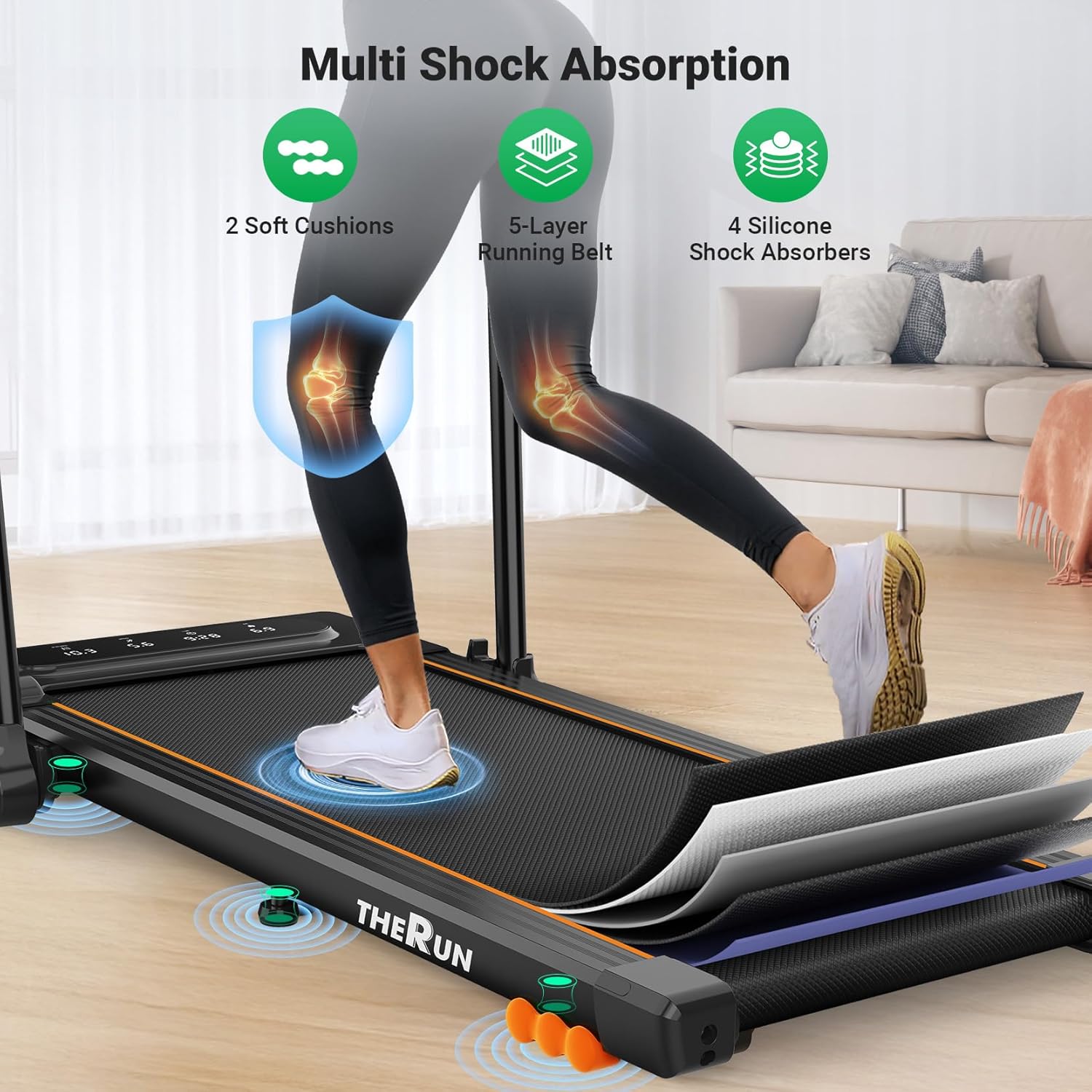 【Premium “4+2” Shock Reduction System】4 Extra shock-absorption absorbers, including a large shock-absorbing pad, provide joint protection, making folding treadmill ideal for effectively reducing joint impact and protects your knees, muscles protection during running, 2 shock absorb cushions help to shock absorbing and noise reducing, making your running quieter and more stable.
