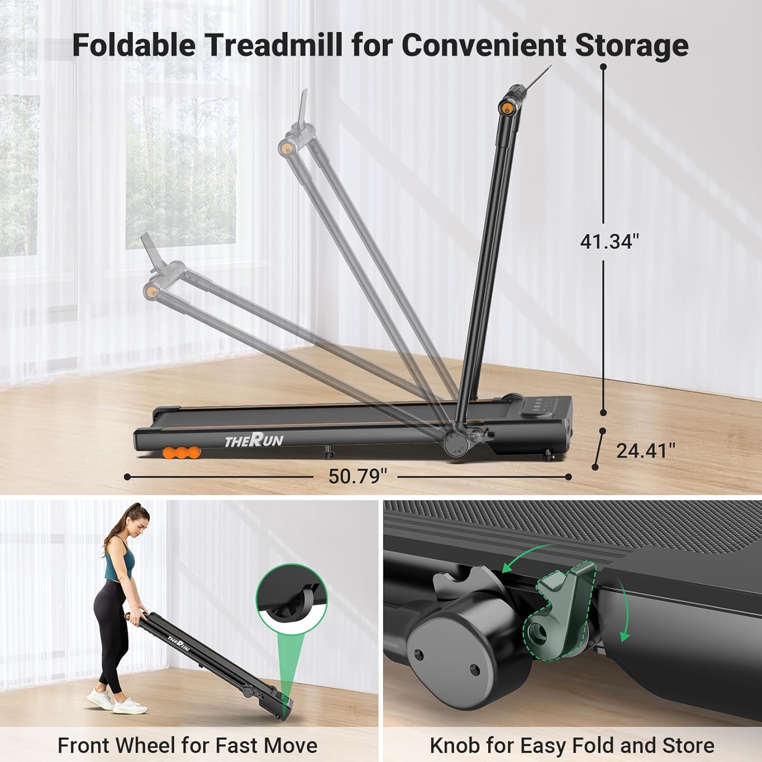 Product Description: Studies have shown that people who sit for more than six hours a day are at a higher risk for heart disease, obesity, cancer, and early death. If you’re looking for a way to sneak in some extra cardio at work, or if you just don’t have enough time to go to the gym outside of work hours, the THERUN treadmill might be a good option for you. The THERUN 2.5HP Treadmill is a foldable treadmill that can be placed under a desk to allow a person to walk while working. walking treadmills under desks are becoming increasingly popular, especially among people who work at desks all day. The treadmill handle provides stability and is very suitable for people who love sports. They’re a great way to get in some exercise, and they can also help you stay more focused and productive when you’re working. Speed: 0.6-7.6MPH Running Belt: 40L x 16W inch Screen Function: Time, Speed, Distance, Calorie Max. User Capacity: 265 pounds Folded Dimension (L x W x H):50.79“ *24.41“ *5.12” Unfolded Dimension (L x W x H):50.79“ *24.41” *41.34“ Product Weight: 59.75 pounds Features: 2 in 1 Walking pad Treadmill Under Desk Walking Pads fit under your desk Compact size design Can be put under most of the desk working stations. 5-layer Anti-slip Running Belt The Belt with great shock absorption to protect your joints. Built-in Wheels Move your small treadmill easily to an apartment Easier to be stored, space-saving. Powerful Enough Motor Quiet performance The 0.6-7.6 MPH speed range is powerful enough for your walking, jogging, and running needs. Multi-functional LCD display LED Touch screen Track your exercise time, burned calories, and distance in real-time. Remote Control for super easy start and operation.