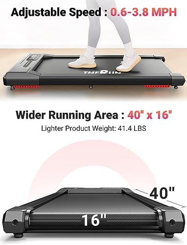 【3 Adjustable Modes】You can adjust the mode according to your own needs. Office Mode 0.6-2.0 MPH, Walking Mode0.6- 3.0 MPH and Jogging Mode 0.6- 3.8 MPH. Meanwhile, we widen the running belt to 40 x 16 inches to ensure a good user experience.