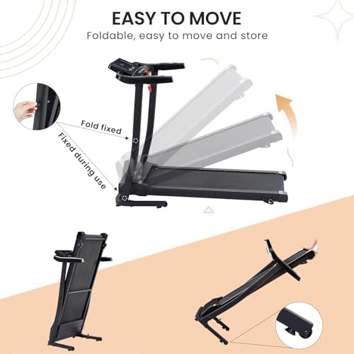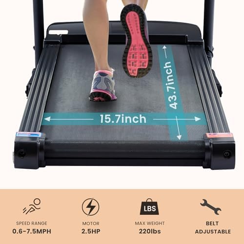 WIDE RUNNING BELT AND FOLDABLE: 43.3″ X 15.7″ running belt provides plenty of leg and elbow room while running, can hold up to 220 lbs. and the treadmill can be folded up after use for space saving and easy storage.