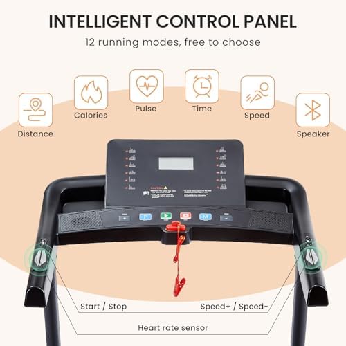 The display can monitor distance, calories, time, speed and heart rate in real time; Connect Bluetooth to play music and answer phone calls; The stand can be used to hold a cell phone, iPad, cup of water and so on. The handle can also be used to adjust the speed, start or stop, and real-time heart rate can be tracked by holding the handle with both hands; there are 12 preset programs to choose the best mode according to your preference and workout goals; there are three progress countdown tracking options for time, speed, and calorie consumption, so that you can stay motivated and know the progress of your workout; when you are working out, you should clip the safety leash to your clothes, and the belt will stop rotating immediately after the magnetic part is detached from the treadmill.stop rotating immediately;