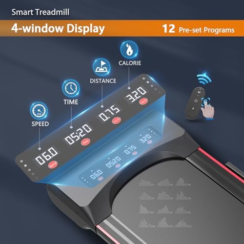 4-window LED Display: The progress of speed, distance, time and calories burned can be tracked in 4 big LED windows of the mini treadmill panel at the same time. With the smart remote control, you can also choose 12 pre-set programs one by one, change the speed or stop the tredmill running in an instant.