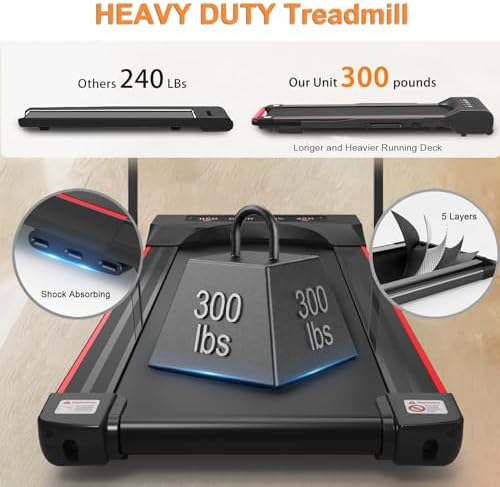 300 LB Capacity: With 5 layer shock-absorbing running belt and 2 soft rubber pads, it can not only provide you with a comfortable exercise experience, but also effectively reduce joint impact and protect your knees. This home treadmill is sturdy and durable to provide good stability for the user weight up to 300 lb.