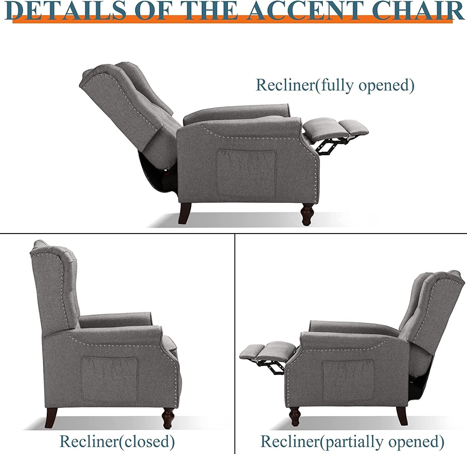 Long Time Use: With solid wood frame and oaken legs,wingback recliner is strong enough to hold 300 lbs.Fabric of cushion is not easy to pill,can use for long time. Its curved design is fit focal point for any room, make great for sit, watch TV, read