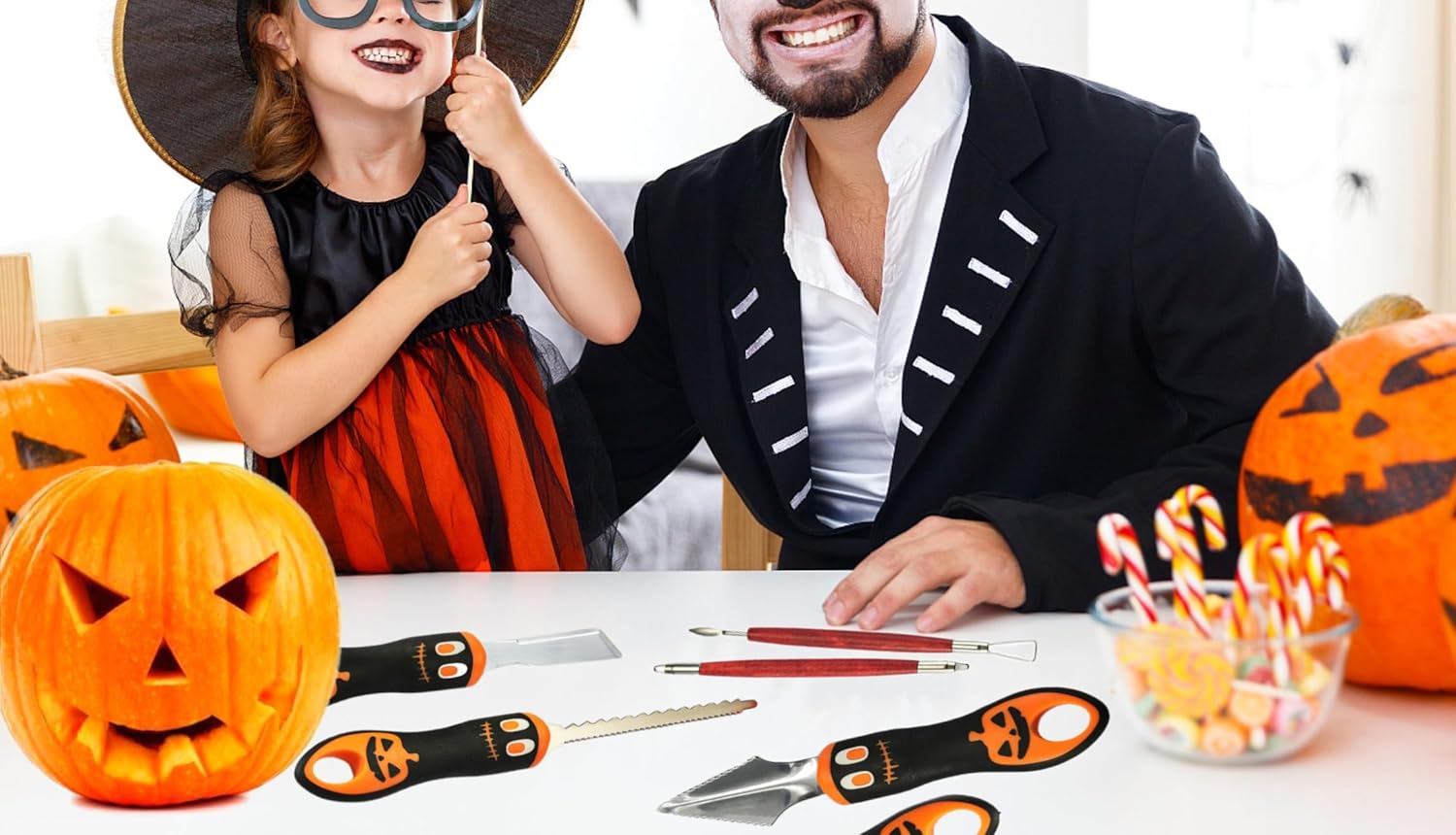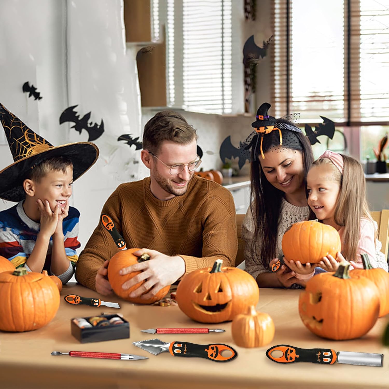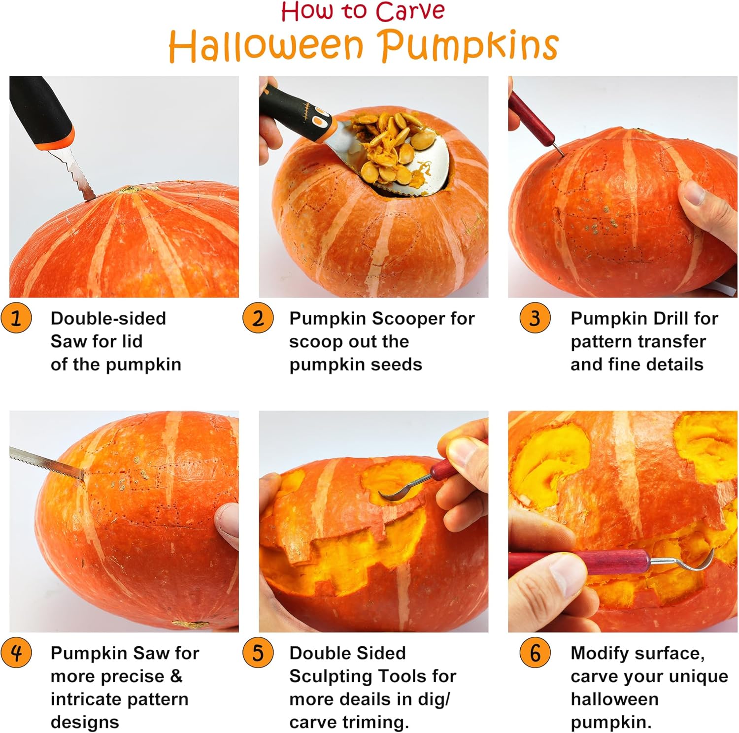 Pumpkin Stainless Steel Carving Kit: The Pumpkin Carving kit includes 11 professional pumpkin carving tools, 1 pumpkin scooper, 1 Etching tool, 1 double-sided saw, 2 small saws and 6 double-sided stainless steel detail sxulpting. Whether you are adult or Children the Pumpkin carving kit can meet your various needs. Children use tools that require adult supervision. Not recommended for children under 7 years old